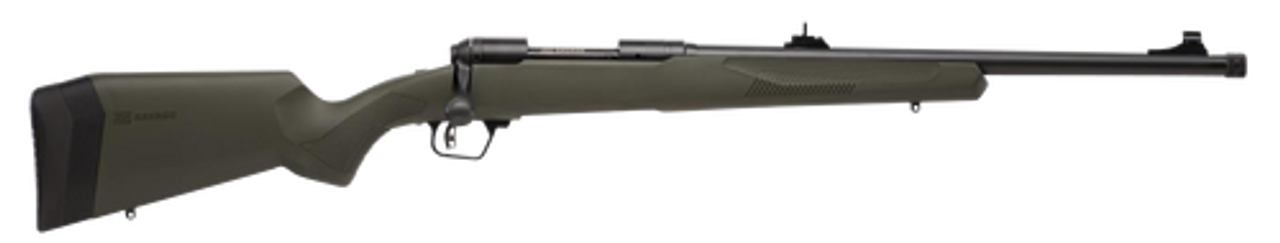 Savage 110 Hogue Hunter, 350 Legend, 18″ Barrel, Black Barrel and Action, Olive DrabGreen Polymer Stock, Adjustable Iron Sights, 4Rd,