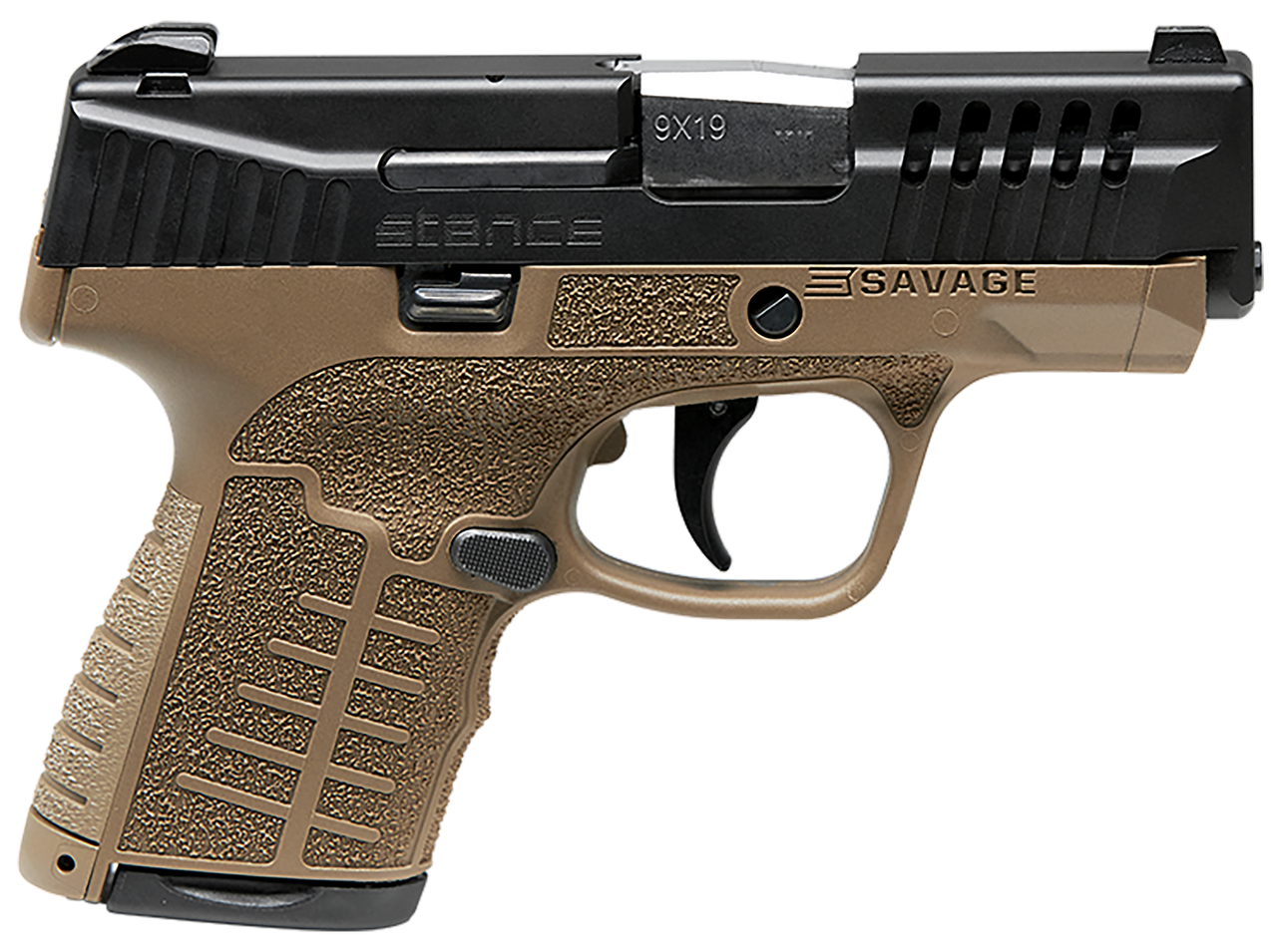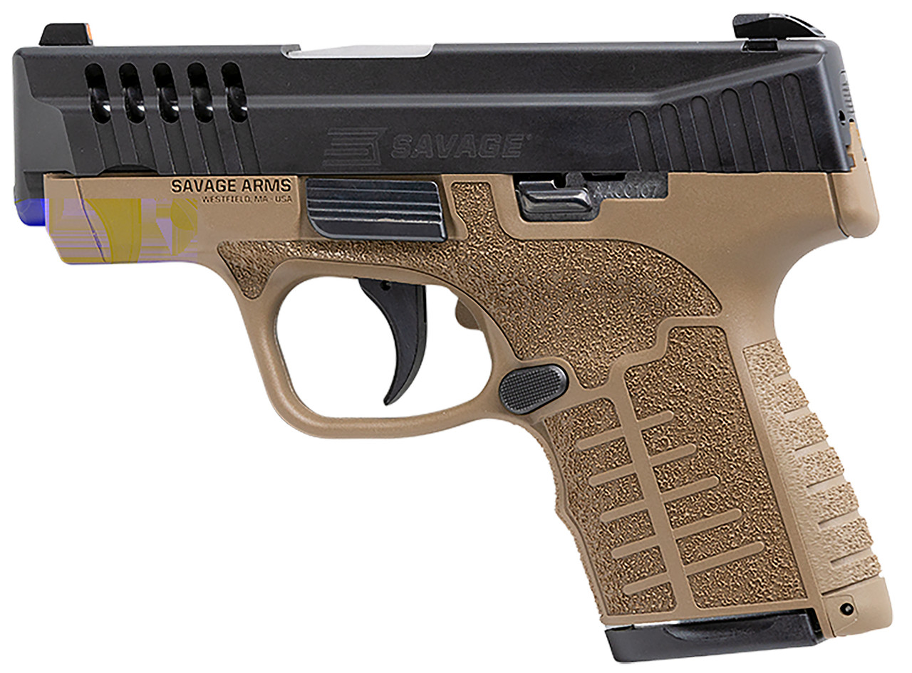 Savage Stance 9mm, 3.2″ Barrel Flat Dark Earth, Black Nitride Stainless Steel Ported Slide, Textured Interchangeable Backstrap Grip & TruGlo Night Sights, 10rd