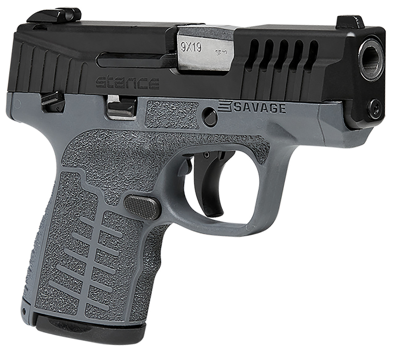 Savage Stance 9mm, 3.2″ Barrel Gray, MS, Black Stainless Steel Ported Slide Gray Interchangeable Backstrap Grip Tritium Night Sights, 10