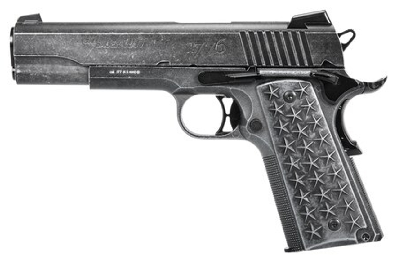 Modeled after the exceptionally popular 1911 We The People full-size centerfire pistol, which is inspired by a rich, patriotic history, the BB pistol version of this uniquely-American handgun features the same custom grips adorned with 50 stars (25 per side) that represent each state of the Union. A distressed finish on the stainless-steel slide and frame includes patriotic engravings, such as 13 stars atop the slide and “We The People” and “1776” on the slide flats.