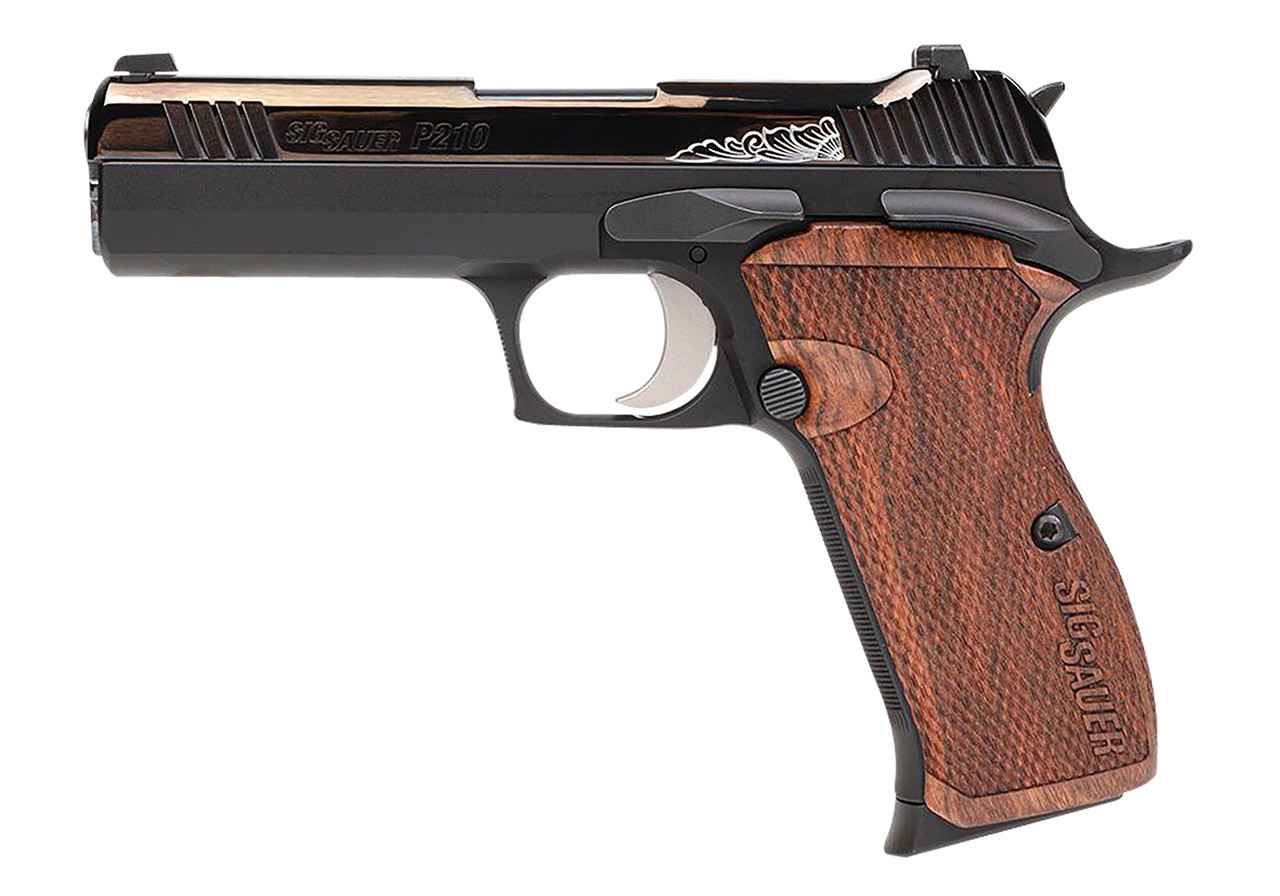The P210 Carry takes the precision of its 1947 Swiss predecessor and greets it with new sleek, custom walnut grips, a precision-machined stainless steel slide and frame, and a lightweight trigger. These updated features pay homage to the original craftsmanship and bring it to a more concealable shooting level. The polished finish sure to impress. Meant to balance well in one hand or two, this P210 Carry is chambered in 9mm and comes with tritium night sights. Also included are three 8 round steel magazines.