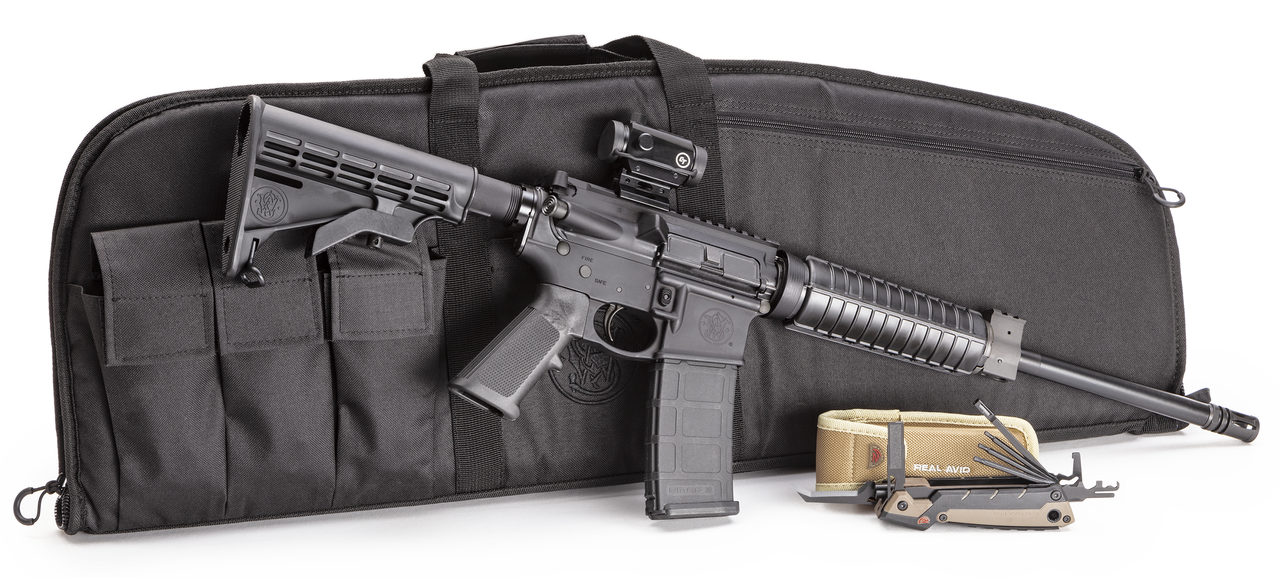 Smith & Wesson M&P15 Sport II Range Kit 5.56/.223, 16″ Barrel, CTS-103, S&W Rifle Case, Real Avid Gun Tool Pro, Black, 30rd