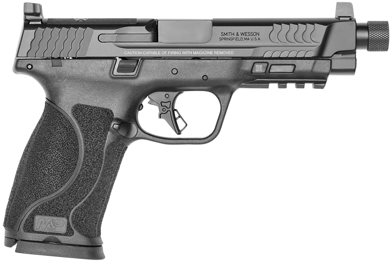 The new Smith & Wesson, The M&P 45 M2.0 45 AUTO Pistol with a 5.125in 1/2×28 threaded barrel, polymer frame, enhanced grip texture, flat face trigger, optic height white dot sights, optics ready slide, reversable magazine release and ships with 4 interchangeable palmswell backstraps