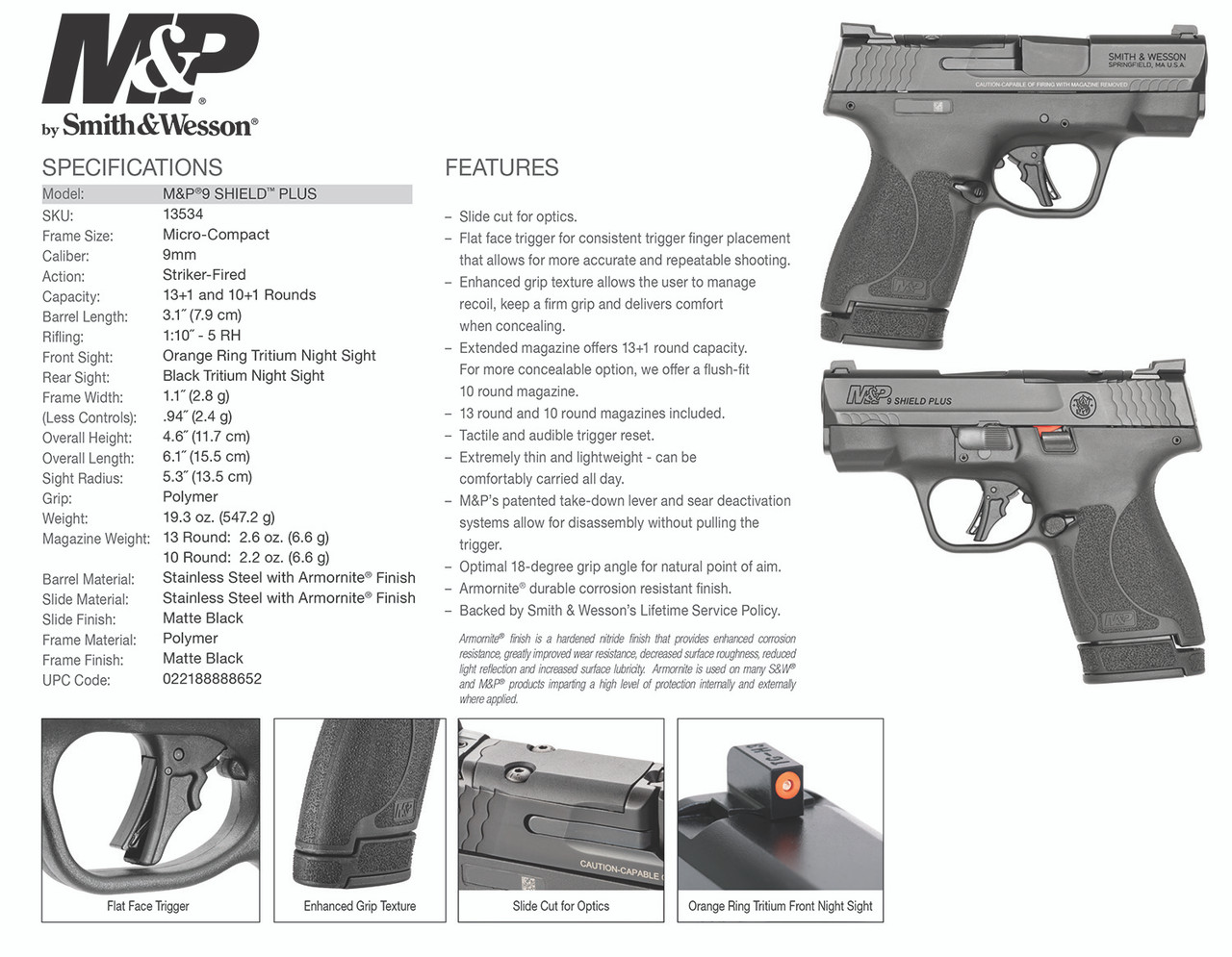 Smith & Wesson M&P9 Shield Plus Micro Compact 9mm, 3.1″ Barrel, Armornite Finish, Black, Tritium Night Sights, Optics Ready, 13534, Two magazines 1/13rd, 1/10rd