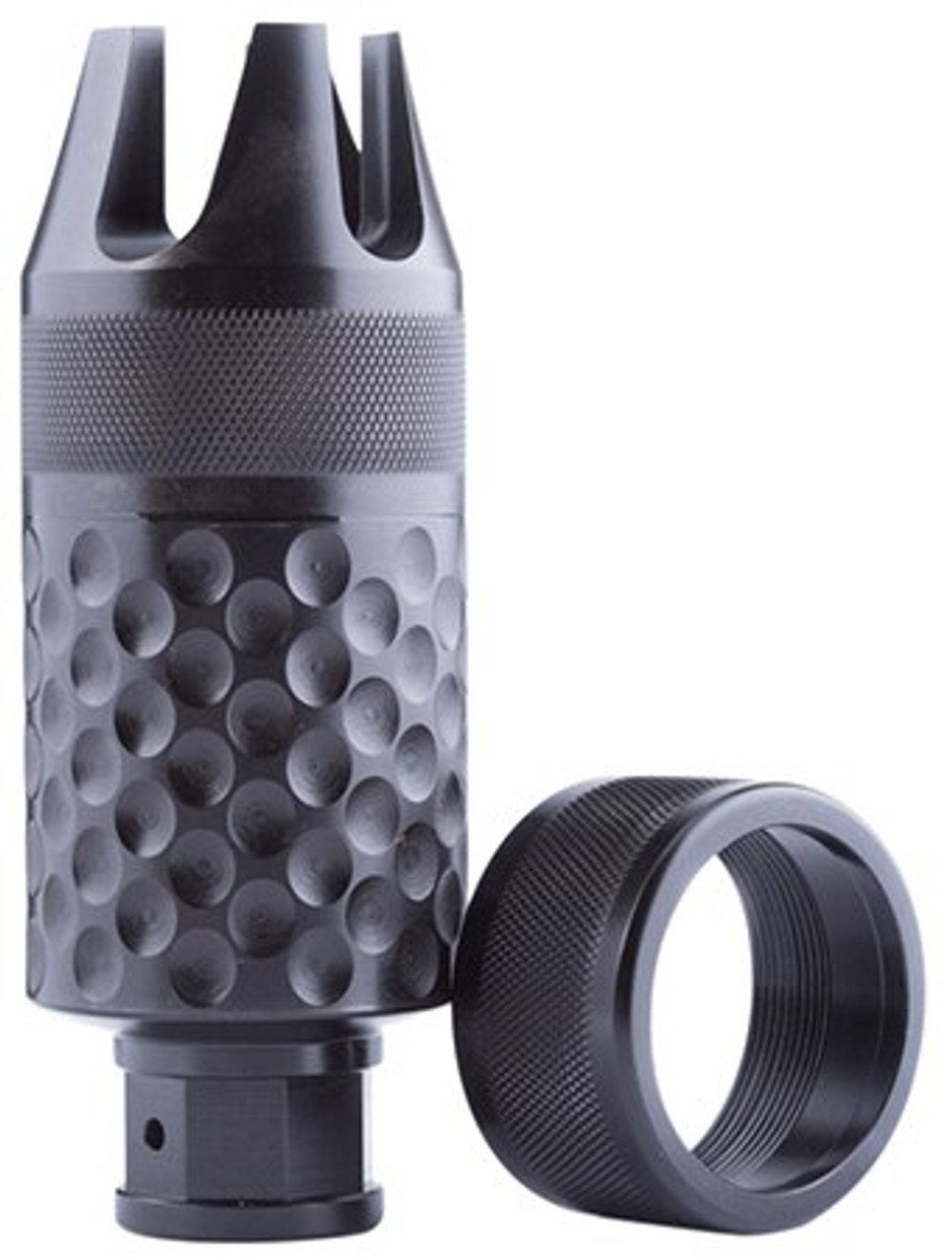 The Barking Spider is designed to redirect the noise, blast, and concussion forward away from the shooter (down range). It was specifically designed to handle full auto and high volume fire. The Barking Spider features a cutting edge blast cone design which is supported in both the front AND the rear. This feature not found on any other Krinkov muzzle brake eliminates the cone from sagging in extremely high temperatures. It is CNC machined from Billet 4140 Chromoly BAR stock. It’s ball dimpled to reduce weight and to help dissipate heat. The body comes pre-drilled for pinning to the barrel. The body is the correct length to make a 14.5″ barrel into 16″ OAL when perm attached. The body is heat treated and features an extremely durable Black Nitride QPQ finish. It includes a thread protector which covers the teeth on the striking device when it’s not in use. It also includes a 5 prong Helix flash suppressor cap which greatly reduces the flash being thrown down range. The Modular design allows you to change configurations around in seconds by simply unscrewing the attachment and screwing on a different one.