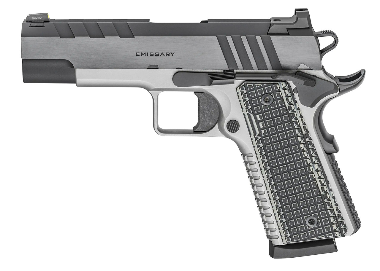Combining compact dimensions with qualities inspired by custom-grade 1911 pistols, the Emissary 4.25” in .45 ACP is ready for everyday carry. Its Tri-Top slide features light-diffusing 40 line-per-inch serrations along the sighting plane, and a heavy-profile forged stainless steel bull barrel ensures maximum accuracy. With a forged hot salt blued slide and forged stainless steel frame with squared triggerguard and grenade-pattern checkering, you get a pistol ready for display or defense.