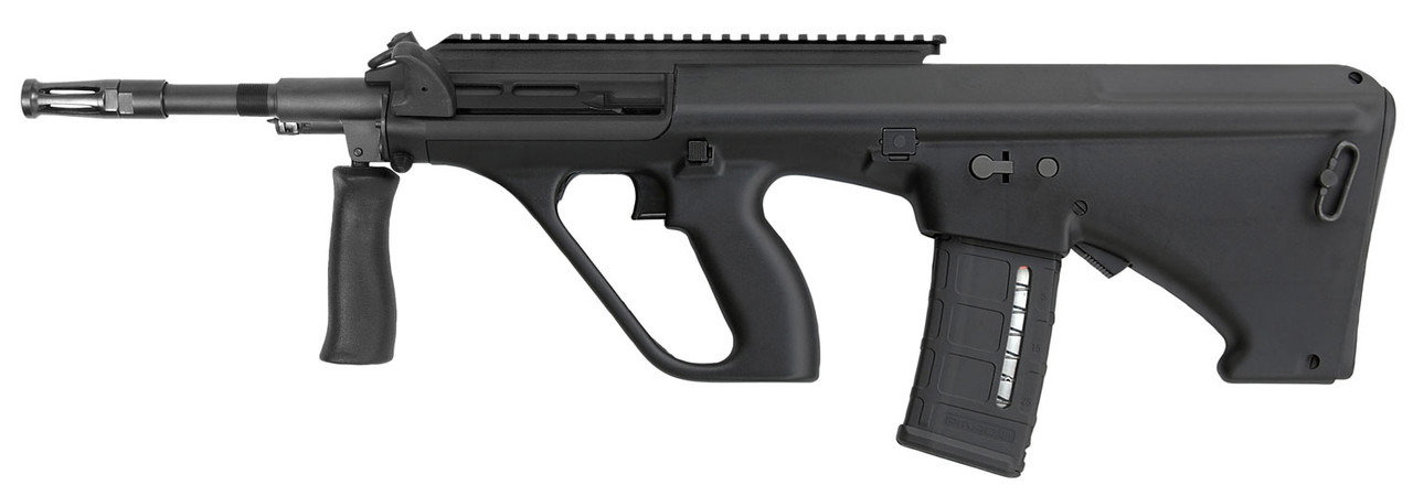 The iconic bullpup-style Steyr AUG has been one of the most recognizable rifles in the world since its adoption by the Austrian army in 1977 and is now available for civilian use as the Steyr AUG A3 M1. The short-stroke gas-piston operation of the AUG runs exceptionally cleaner by nature because all of the operational exhaust gas vents out of the front of the rifle. It also features a quick-change barrel with a collapsible forward grip as well as a two-position cross-bolt safety that locks the trigger. This NATO version rifle accepts genuine Steyr AUG magazines as well as standard STANAG (AR) magazines.