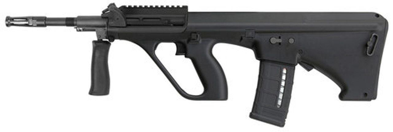 The iconic bullpup-style Steyr AUG has been one of the most recognizable rifles in the world since its adoption by the Austrian army in 1977 and is now available for civilian use as the Steyr AUG A3 M1, a semi-convertible ambidextrous rifle platform with an adjustable short-stroke, gas-piston operation chambered for 5.56x45mm (.223 Remington) ammunition. The AUG A3 M1 boasts an overall length of just 28.15″, including its 16″ heavy barrel, making it at least 8″ shorter than an M4 carbine with a comparable-length barrel. The short-stroke gas-piston operation of the AUG runs exceptionally cleaner by nature because all of the operational exhaust gas vents out of the front of the rifle. The AUG A3 M1 has all the classic features and benefits that established it as the pinnacle of modern rifle design. It also features a quick-change barrel with a collapsible forward grip as well as a two-position cross-bolt safety that locks the trigger.
