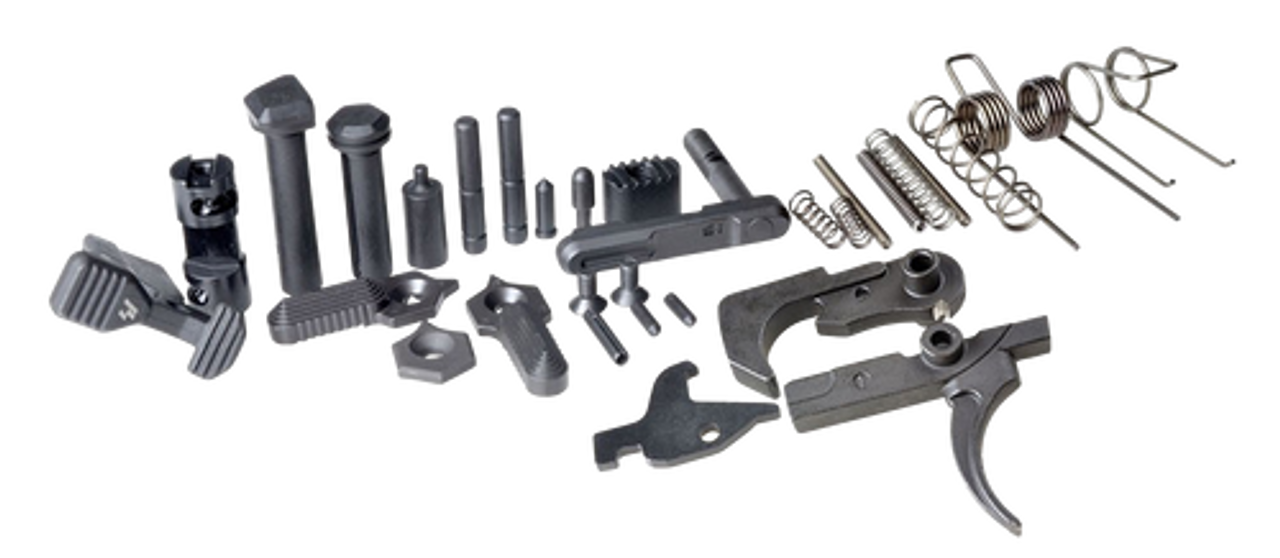 The Enhanced Lower parts kit offers a convenient upgrade package for the AR15 for those looking for a complete Strike Industries solution for new builds, or to update their plain jane AR. The complete kit features a fire control group which offers a crisp 4.5-5.5 lb pull, with unmatched smoothness for mil-spec style AR15 triggers. This kit includes a bolt catch spring, buffer retainer spring, disconnector spring, hammer spring, magazine catch spring, pivot detent and spring, selector detent and spring, takedown detent and detent spring, trigger detent, pin, and spring, bolt catch plunger and roll pin, and a buffer retainer. It also includes enhanced bolt and magazine catch, magazine catch button, pivot pin, takedown pin, two SI selector lever, SI selector end plate, and a SI 60-90° 3-in-1 selector shaft.