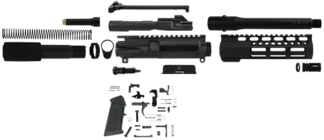 The TacFire Pistol Kit contains- 45 ACP 7.5″ barrel/nitride; birdcage flash hider w/crush washer; ultra slim 7″ clamp on MLOK free float handguard; AR15 5.56/.223/.300AAC stripped billet upper receiver w/M4 feed ramps, 45 ACP-Glock bCG; AR15/.556 Mil-Spec charging handle aluminim w/steel latch; dust cover; AR15 forward assist; AR15 standard receiver end plate; Mil-Spec/commercial castle nut/steel; pistol buffer tube w/foam; 5.5oz buffer w/tube spring; AR15 USA made lower parts kit and a AR15 standard A2 style black pistol grip. *Sports South Exclusive.