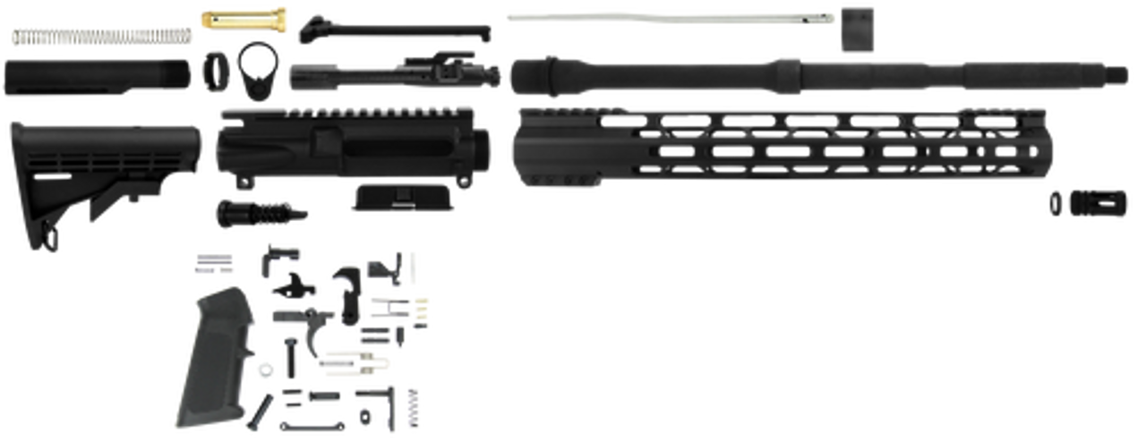 The TacFire SS-RK556 rifle build kit contains- 16″ 5.56 Nato, M4 contour barrel/nitride; birdcage flash hider w/crush washer; 15″ MLOK free float handguard; AR15 5.56/.223/.300AAC stripped billet upper receiver w/M4 feed ramps/.556 Mil-Spec charging handle aluminum w/steel latch; dust cover; AR15 forward assist; AR15 standard receiver end plate; Mil-Spec/commercial castle nut/steel; buffer tube aluminum; AR 15 3 oz buffer w/tube spring; AR15 USA made lower parts kit and a AR15 standard A2 style black pistol grip/A2 style. *Sports South Exclusive.