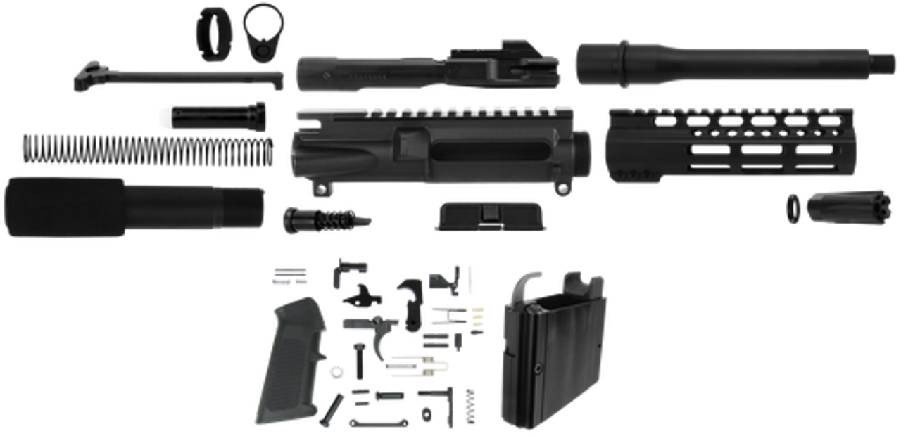 The TacFire Pistol Kit contains- 9mm 7.5″ barrel/nitride; 9mm flash forwarder linear compensator, nitride w/crush washer; ultra slim 7″ MLOK handguard w/barrel nut; AR15 5.56/.223/.300AAC stripped billet upper receiver w/M4 feed ramps, 9mm G2 9mm GEN 2 Hybrid BCG; AR15/.556 Mil-Spec charging handle aluminim w/steel latch; dust cover; AR15 forward assist; AR15 standard receiver end plate; Mil-Spec/commercial castle nut/steel; pistol buffer tube w/foam; 5.5oz buffer w/tube spring; AR15 USA made lower parts kit; AR15 standard A2 style black pistol grip and a 9mm Colt magazine magwell adapter. *Sports South Exclusive.