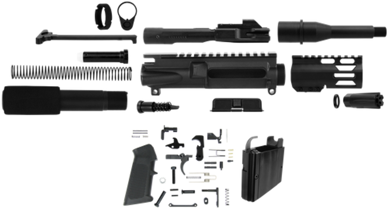 The TacFire Pistol Kit contains- 9mm 5″ barrel/nitride; 9mm flash forwarder linear compensator, nitride w/crush washer; ultra slim 5″ MLOK handguard w/barrel nut; AR15 5.56/.223/.300AAC stripped billet upper receiver w/M4 feed ramps, 9mm G2 9mm GEN 2 Hybrid BCG; AR15/.556 Mil-Spec charging handle aluminim w/steel latch; dust cover; AR15 forward assist; AR15 standard receiver end plate; Mil-Spec/commercial castle nut/steel; pistol buffer tube w/foam; 5.5oz buffer w/tube spring; AR15 USA made lower parts kit; AR15 standard A2 style black pistol grip and a 9mm Colt magazine magwell adapter. *Sports South Exclusive.