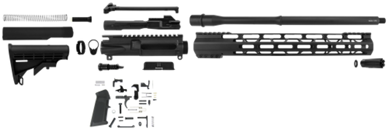 The TacFire Rifle Kit contains- 9mm 16″ barrel/nitride; 9mm flash forwarder style muzzle brake; slim 7″ MLOK handguard 15″ w/barrel nut; AR15 5.56/.223/.300AAC stripped billet upper receiver w/M4 feed ramps, 9mm Gen 2 Hybrid BCG; AR15/.556 Mil-Spec charging handle aluminim w/steel latch; dust cover; AR15 forward assist; AR15 standard receiver end plate; Mil-Spec/commercial castle nut/steel; Mil-Spec buffer tube w/aluminum; 5.5oz buffer w/tube spring; Mil-Spec M4 style 6 position stock; AR15 USA made lower parts kit; AR15 standard A2 style black pistol grip. *Sports South Exclusive.