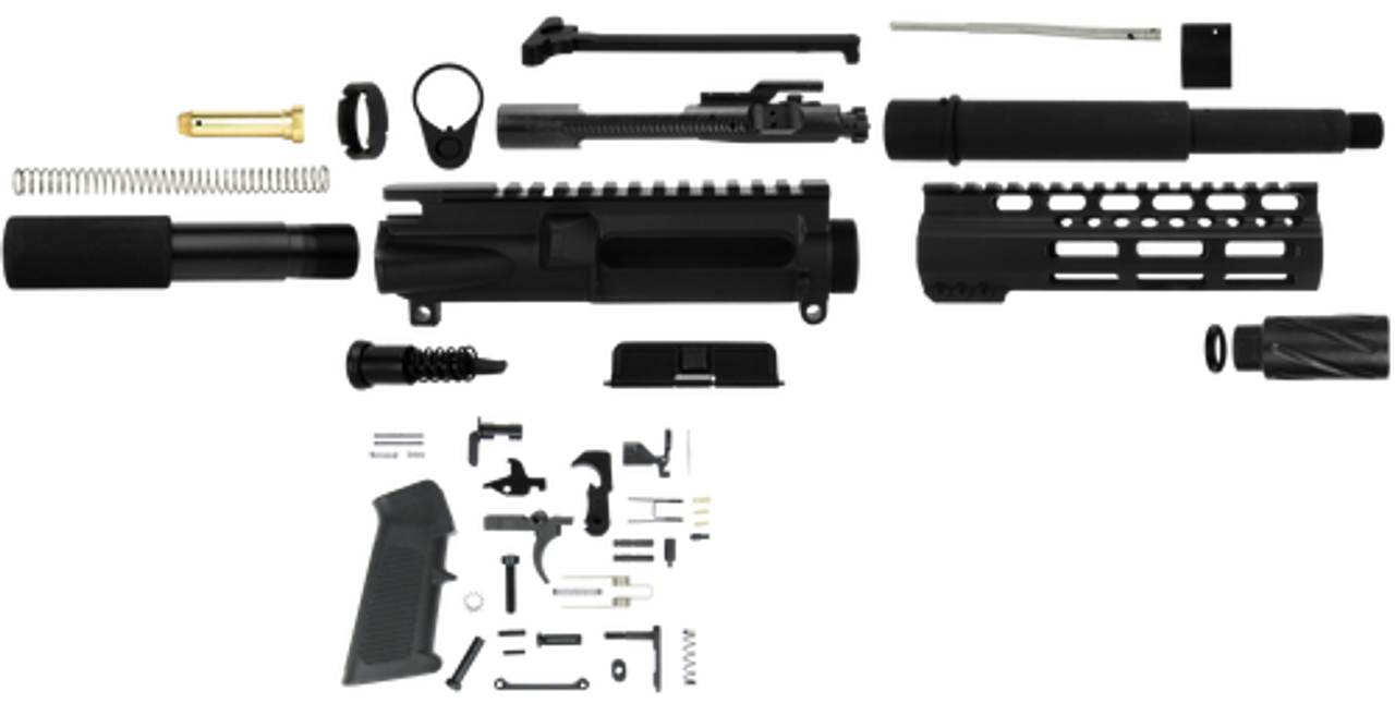 The TacFire Pistol Kit contains- .300 AAC Blackout 7.5″ Barrel/Parkerized; .308 spiral fluted flash can W/crush washer; AR15/.750 micro/low profile gas block/Mil-Spec/steel; pistol length gas tube w/pin/steel; ultra slim 7″ clamp on MLOK free float handguard; AR15 5.56/.223/.300AAC stripped billet upper receiver w/M4 feed ramps; AR15 5.56 NATO bolt carrier group/MPI tested/Nitride; AR15/.556 Mil-Spec charging handle aluminum w/steel latch; dust cover; AR15 forward assist, AR15 standard receiver end plate; Mil-Spec/commercial castle nut/steel; pistol buffer tube w/foam; 3 oz buffer w/tube spring; USA made AR15 lower parts kit and an AR15 standard A2 style black pistol grip. *Sports South Exclusive.