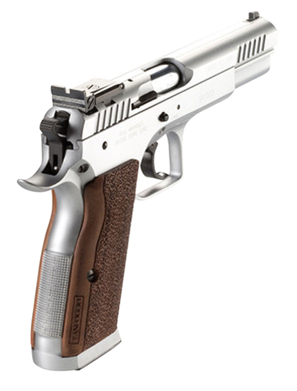 The Defiant Limited Pro double/single action pistol is designed specifically to meet the requirements of the I.P.S.C Production Class. This model features hard chromed finishing, squared trigger guard, checkering on the front and back of the frame for increased grip, polygonal rifle, and larger slide serrations. Standard on the Limited Pro are the Custom Safety, Custom Magazine Release that is user reversible, walnut checkered grips, fully adjustable rear Supersight, and interchangeable front sight.