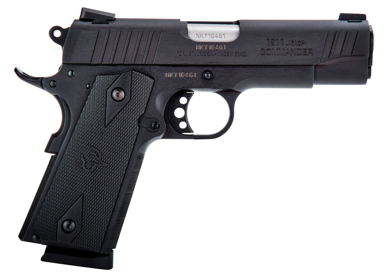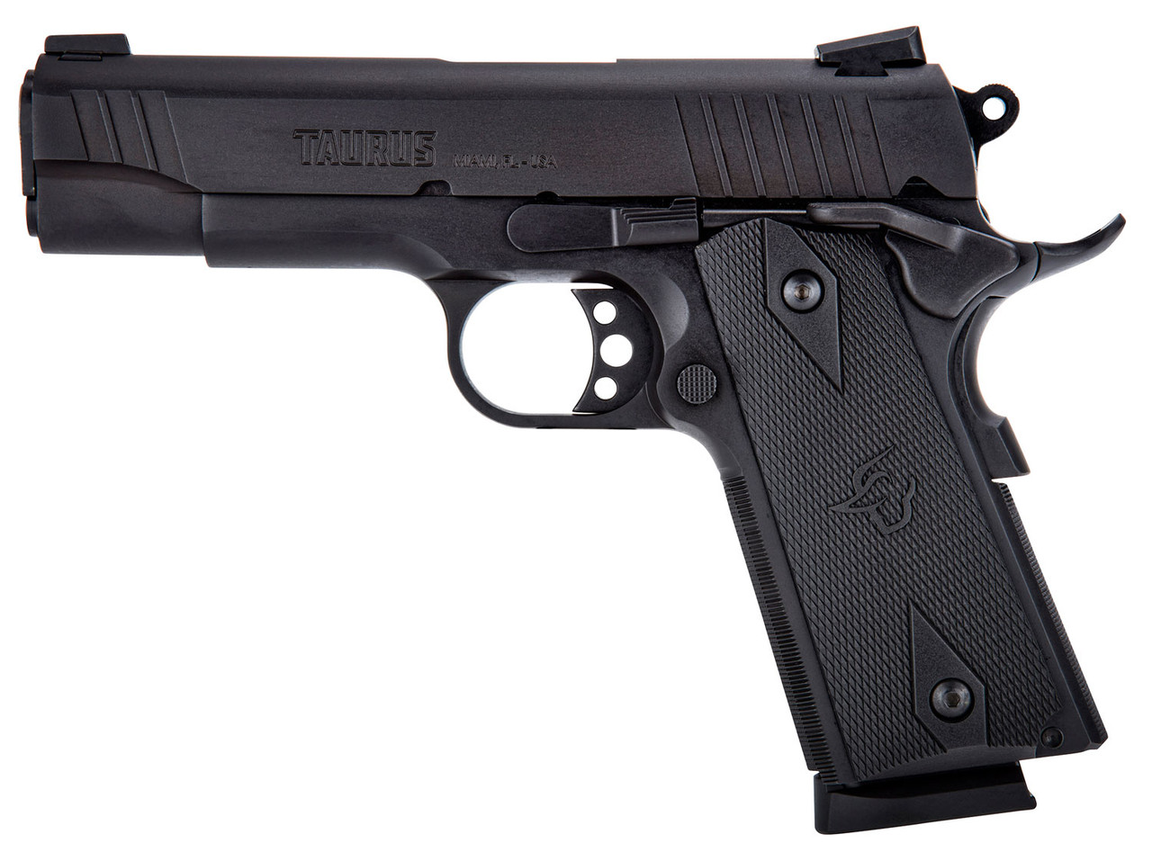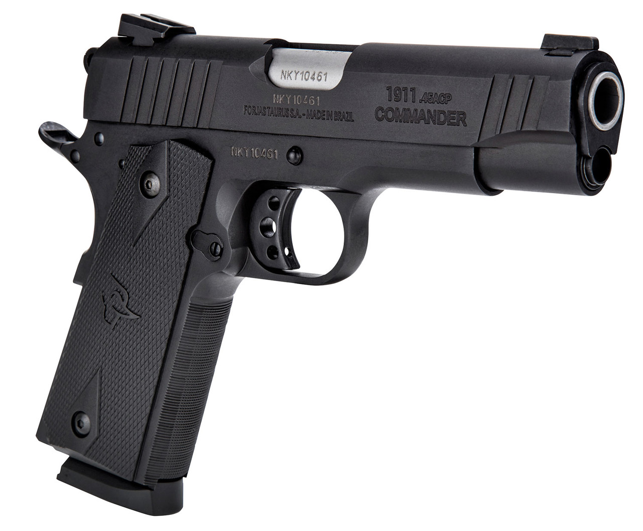 The Taurus 1911 Commander has a shorter profile than traditional full-size 1911’s but maintains a full-size grip. Perfect for carry, self defense or home use, the Commander features a monochromatic black on black finish, Novak drift adjustable front and rear sights, checkered black grips and extended beavertail that offers comfortable shooting with great control.