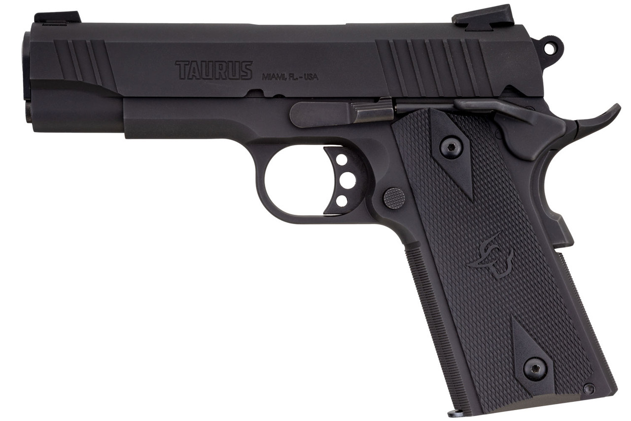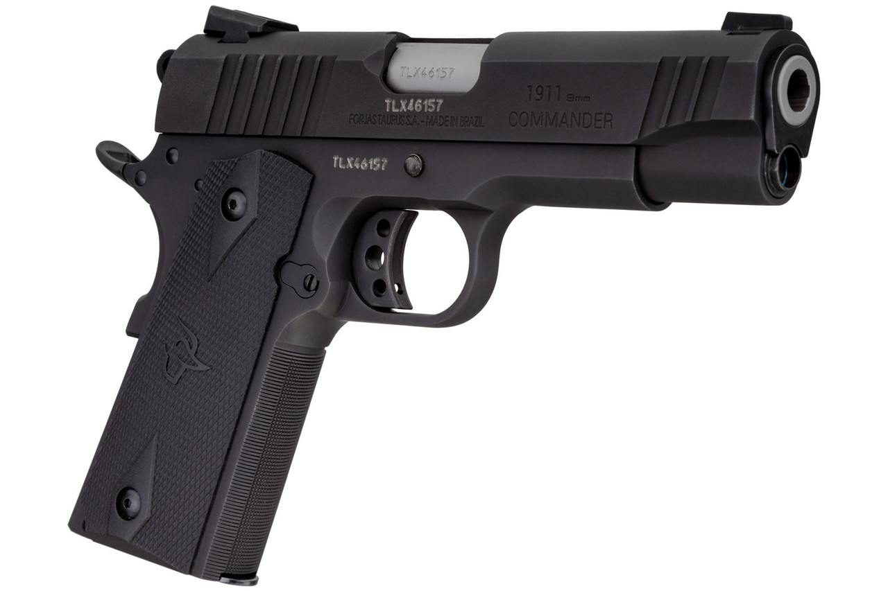 The Taurus 1911 Commander has a shorter profile than traditional full-size 1911’s but maintains a full-size grip providing a positive grip purchase. Perfect for carry, self defense or home use, the Commander features a monochromatic black on black finish, Novak drift adjustable front and rear sights, checkered black grips and extended beavertail that offers comfortable shooting with great control. The Commander is easily customized as it is built with industry standard components.