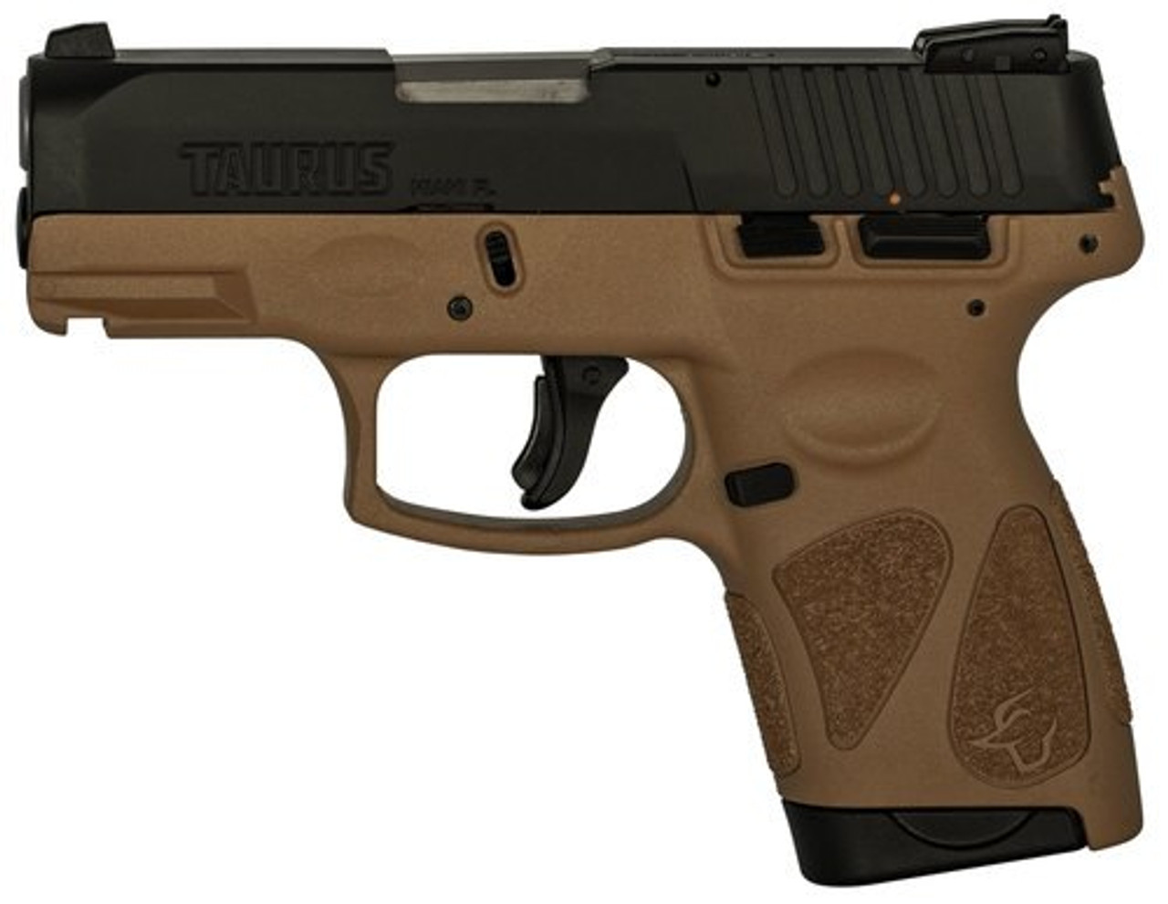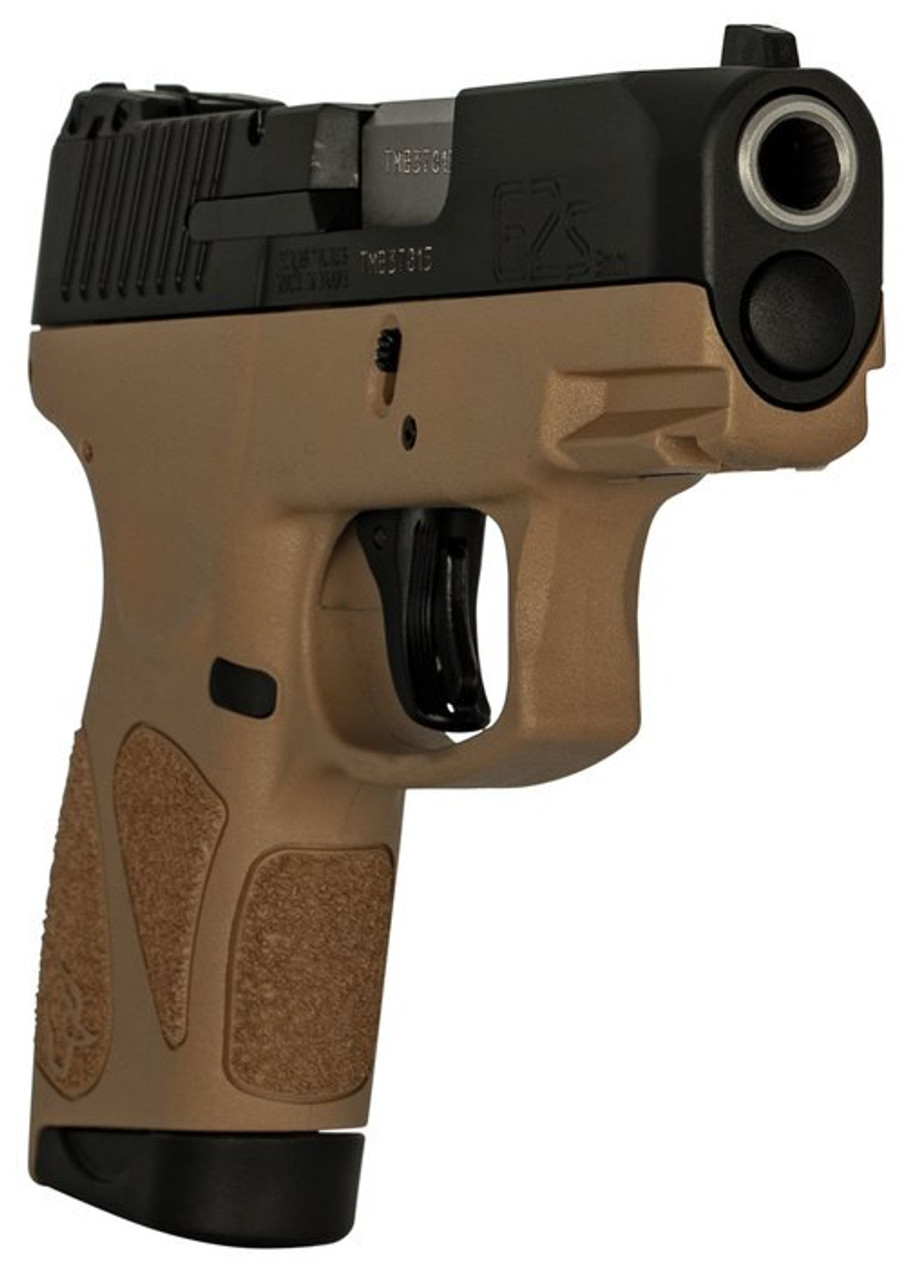 This G2S model has a tan frame with a matte black carbon steel slide. It includes two 7-round magazines.