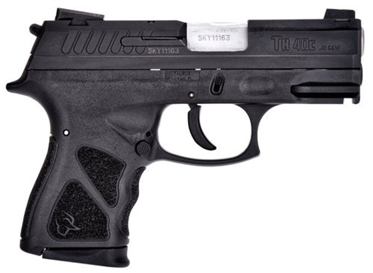 The Taurus TH40 features a polymer frame and grip with a black finish and its slide has Novak drift adjustable sights.