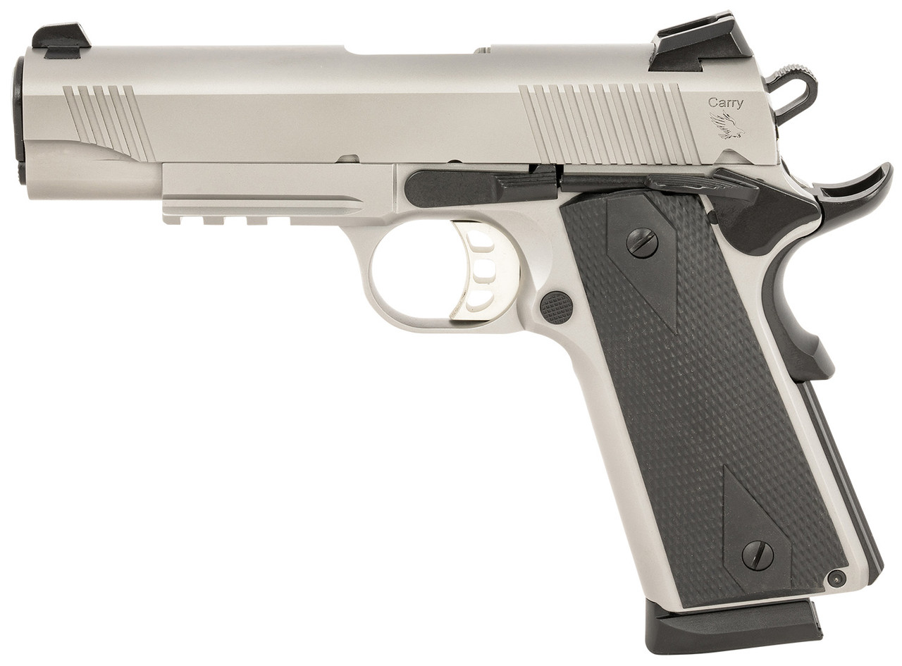 Tisas 1911 Carry pistol is a modernized version of the venerable 1911 pistol. The pistol features a hammer forged slide with front and rear slide serrations; hammer forged, steel full-size frame; accessory rail; flared and lowered ejection port; skeletonized hammer and trigger; ambidextrous extended safety; 3-Dot Low-Profile Sights, Novak Style Cut and Series 70 Internals. Includes two magazines, cleaning kit, owners manual, waterproof and lockable hard case w/fitted cut foam insert.