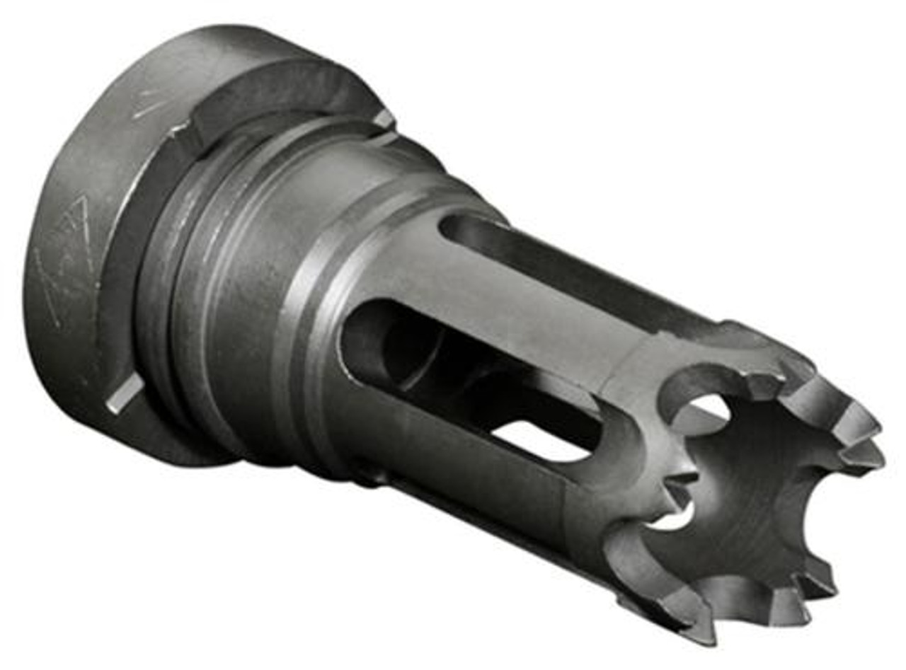 The Phantom flash hider is used with the YHM Q.D. Phantom Sound Suppressor. It retains the excellent flash hiding capabilities of the original Phantom. This flash hider also accepts the Phantom 7.62 Sound Suppressor. This flash hider will NOT accommodate the YHM .22 Q.D. or 9mm Q.D. suppressors. The Carbon Scrapers (Teeth) remove or scrape carbon from the internal support system of your can. The Dual Support System supports and aligns the suppressor to your bore. The five (5) port design decreases visible flash. The External Locking Mechanism keeps heat away from the spring mechanism. A High-Temperature Spring holds up better over a longer service life. The aggressive teeth give it a mean aggressive look. The External Grooves were removed for a sleek smooth look and it reduces carbon build-up for easy clean up. The Dust Enclosure hides and protects all internal moving parts within the quick disconnect system. This model is for 5.56mm with 1/2″-28 TPI.